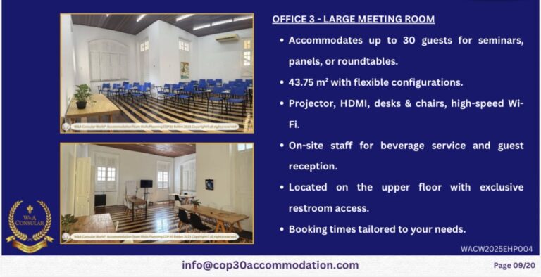 When it comes to sourcing the most executive and secure event spaces for world summits, W&A Consular World® global diplomatic sourcing consultancy, stands unparalleled. Whether you’re planning a Private Sector gathering in Belém for networking drinks reception or a executive break out space for group sessions with Catering included during the COP30, our expertise ensures your event is executed flawlessly. #aboveandbeyond